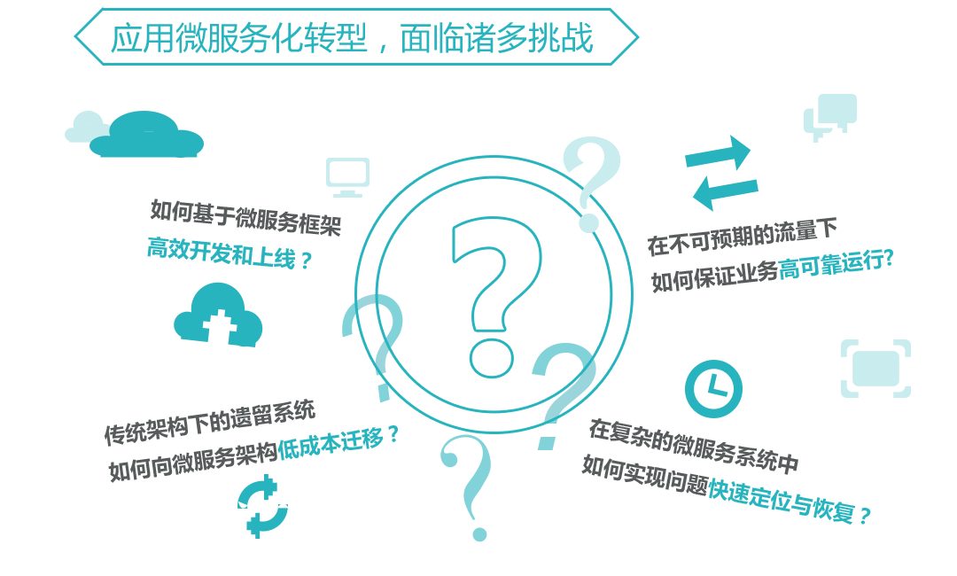 應用微服務化轉型,面臨諸多(duō)挑戰。如何支持大(dà)量的微服務頻繁部署和(hé)升級,不中斷業務;如何保障大(dà)量微服務運行(xíng)的可(kě)用性、可(kě)靠性;如何支持微服務雲環境下故障的快速定界、定位等是亟需解決的問題。