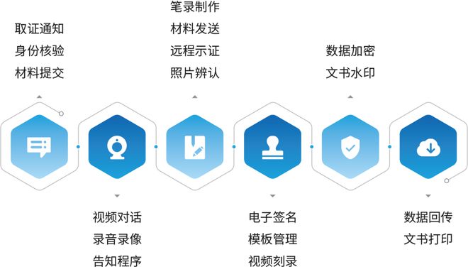 取證通(tōng)知人(rén)臉識别身份核驗材料提交 視(shì)頻對話(huà)全程錄音(yīn)錄像告知程序 筆錄制(zhì)作(zuò) 材料發送 遠程示證照片辨認 電(diàn)子簽名确認 自述問答(dá)模闆視(shì)頻刻錄數(shù)據多(duō)重加密文書(shū)水(shuǐ)印數(shù)據回傳文書(shū)打印